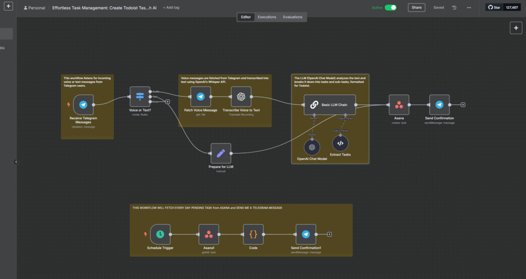 This workflow uses Telegram, OpenAI, and Asana, all stitched together with the open-source automation tool n8n.